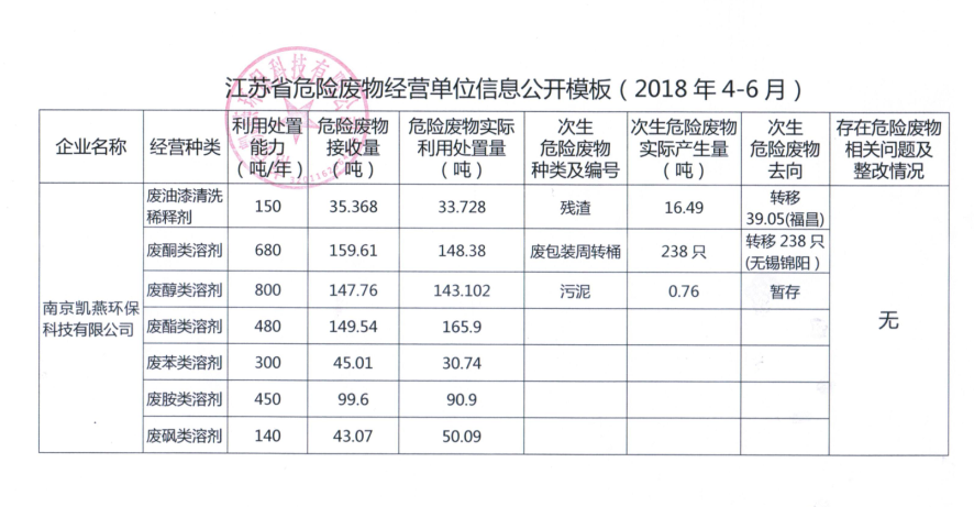 江蘇省危險廢物經(jīng)營單位信息公開模板(2018年4-6月)
