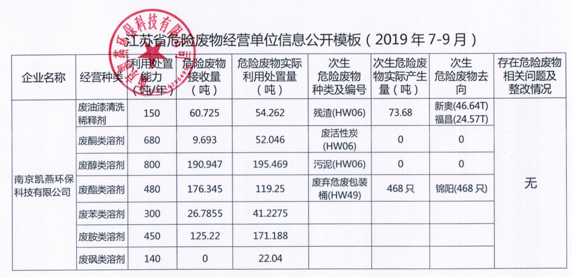 江蘇省危險廢物經營單位信息公開模板(2019年7-9月)