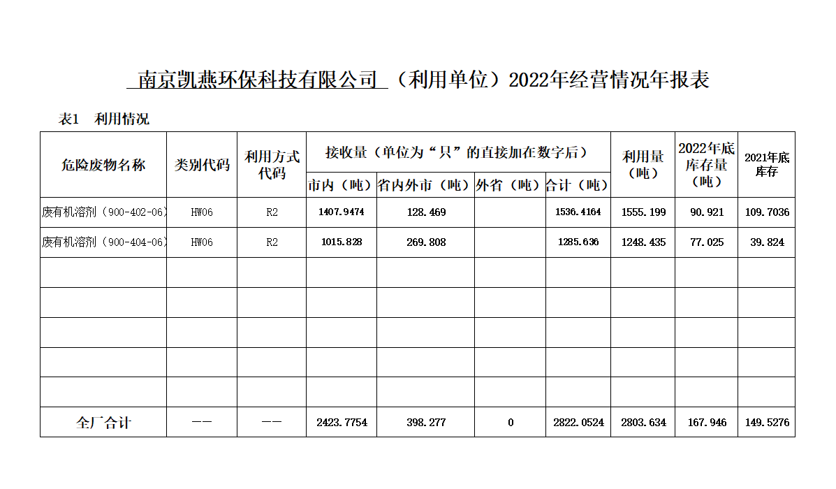 南京凱燕環(huán)??萍加邢薰?022年危險(xiǎn)廢物經(jīng)營(yíng)情況報(bào)表
